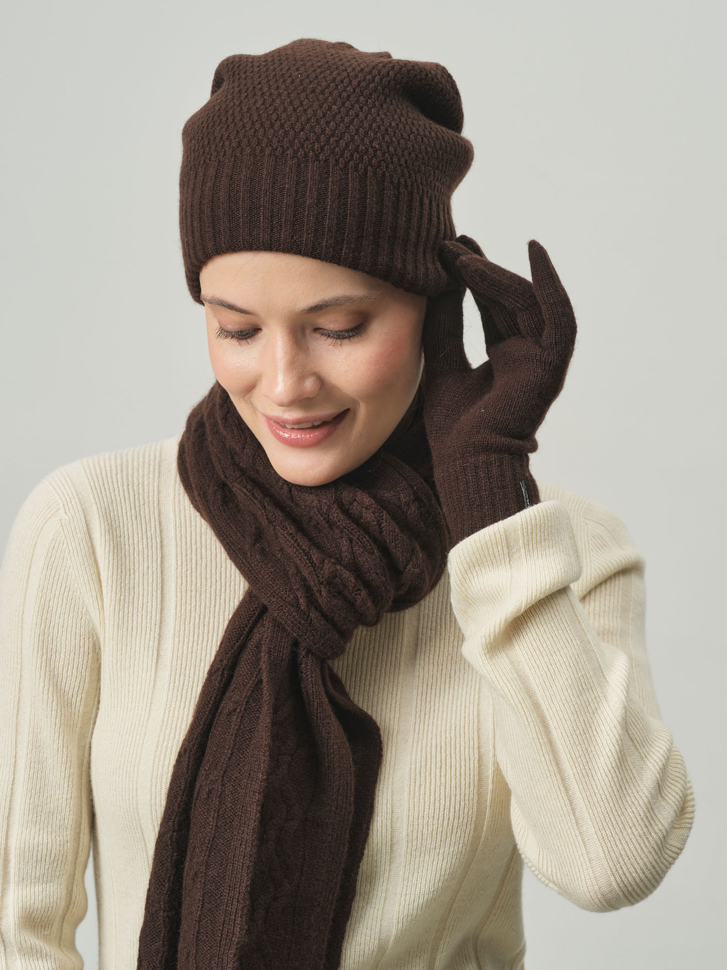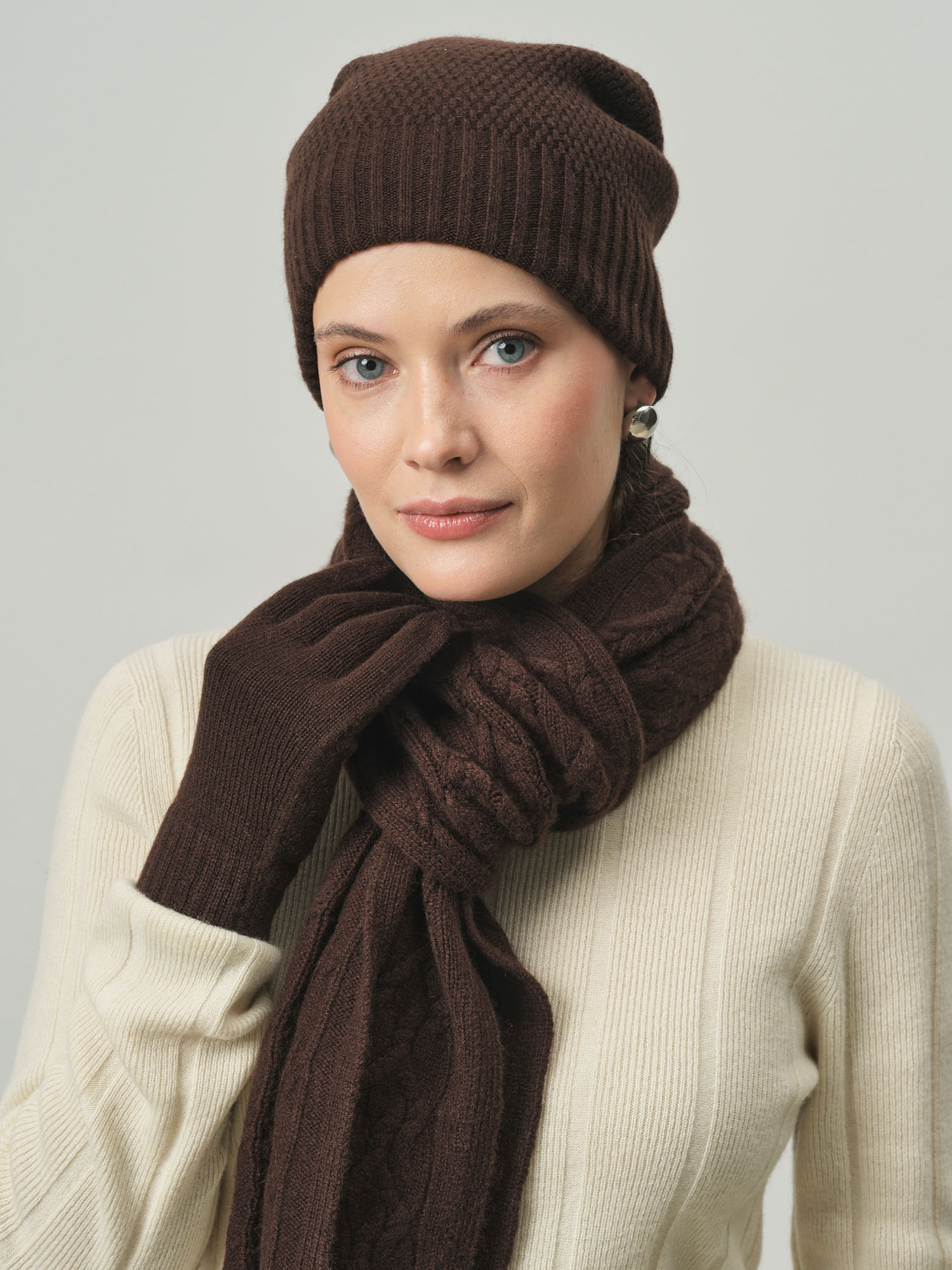 Кашемировая шапка с выразительной вязкой — стильный аксессуар, который сочетает тепло, комфорт и акцентный внешний вид. Идеально дополняет зимние образы, добавляя им глубину и текстуру.