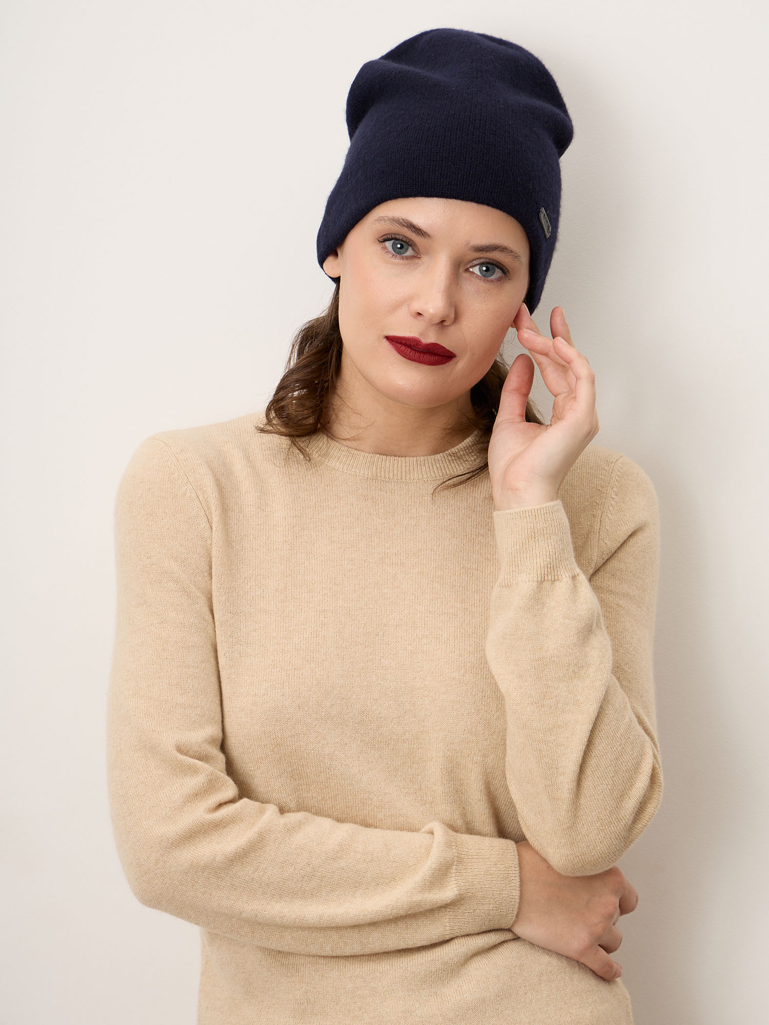 Лаконичная модель в формате классической шапки-бини с мягкой удлинённой формой. Аккуратно облегает голову, создавая элегантный силуэт без излишнего объёма. Двойная вязка обеспечивает дополнительное тепло и аккуратную посадку. Минималистичная фирменная нашивка подчеркивает премиальный характер изделия.