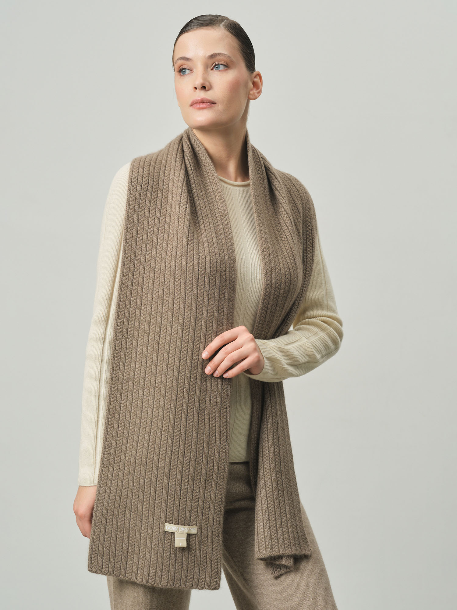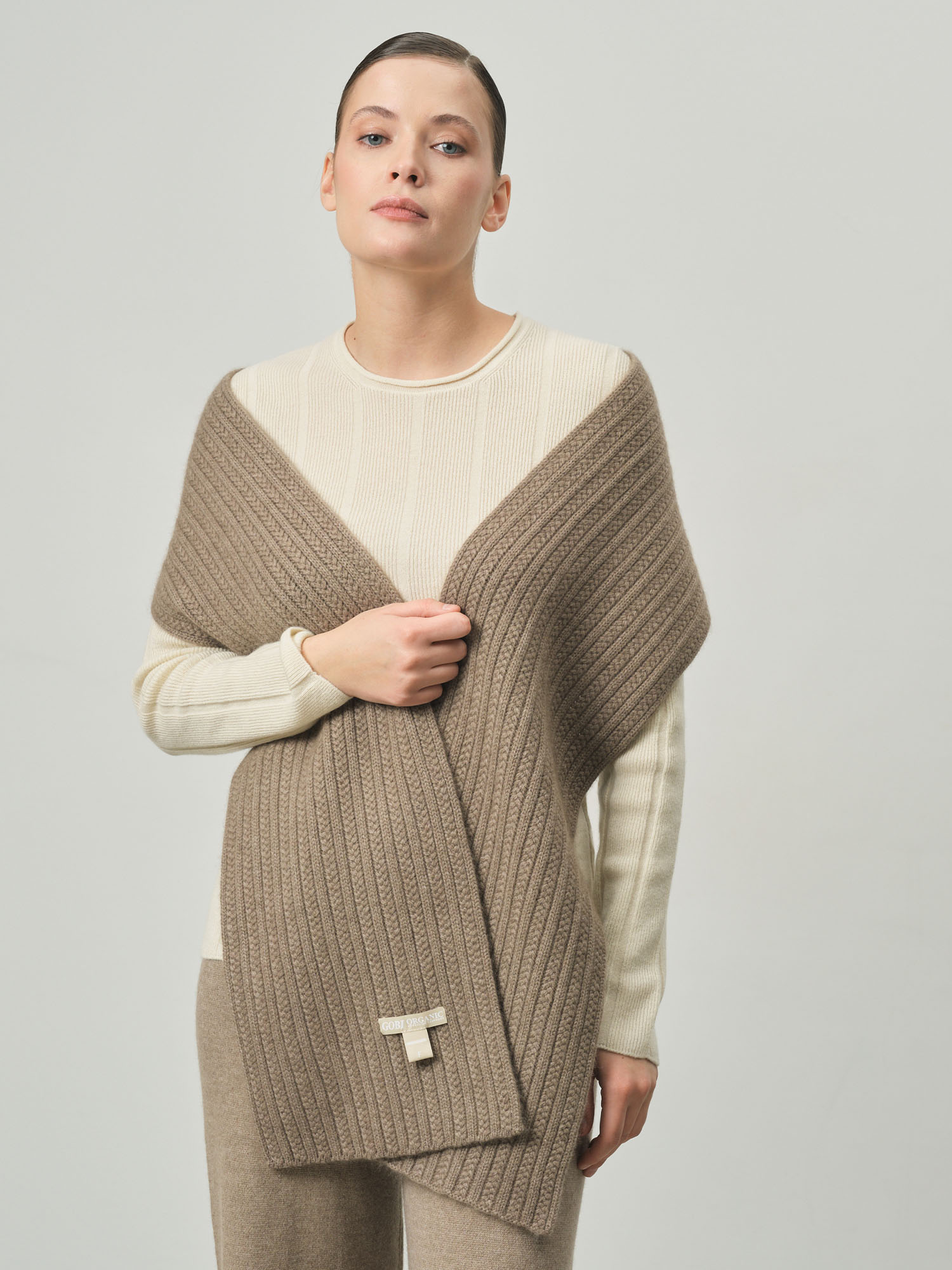 Модель выполнена в классической прямоугольной форме с фактурной вязкой в рубчик. Минималистичный дизайн подчёркивает благородную текстуру кашемира и делает аксессуар универсальным элементом гардероба.
