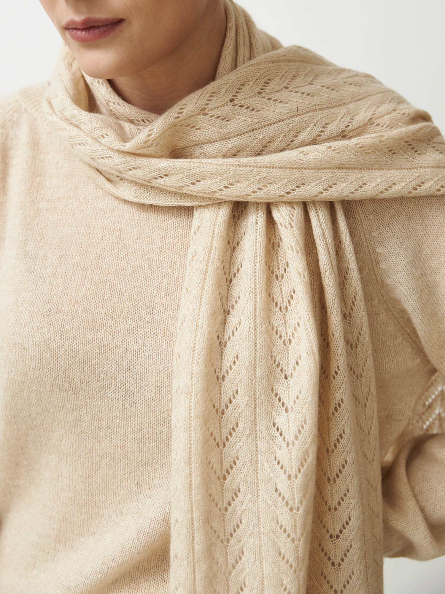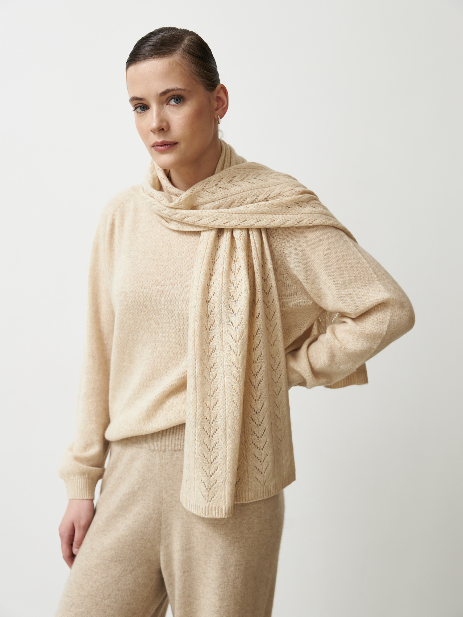 Модель выполнена в классической прямоугольной форме с изящным фактурным узором в виде вертикальной косы. Декоративная вязка придаёт аксессуару глубину и подчёркивает натуральную текстуру кашемира.