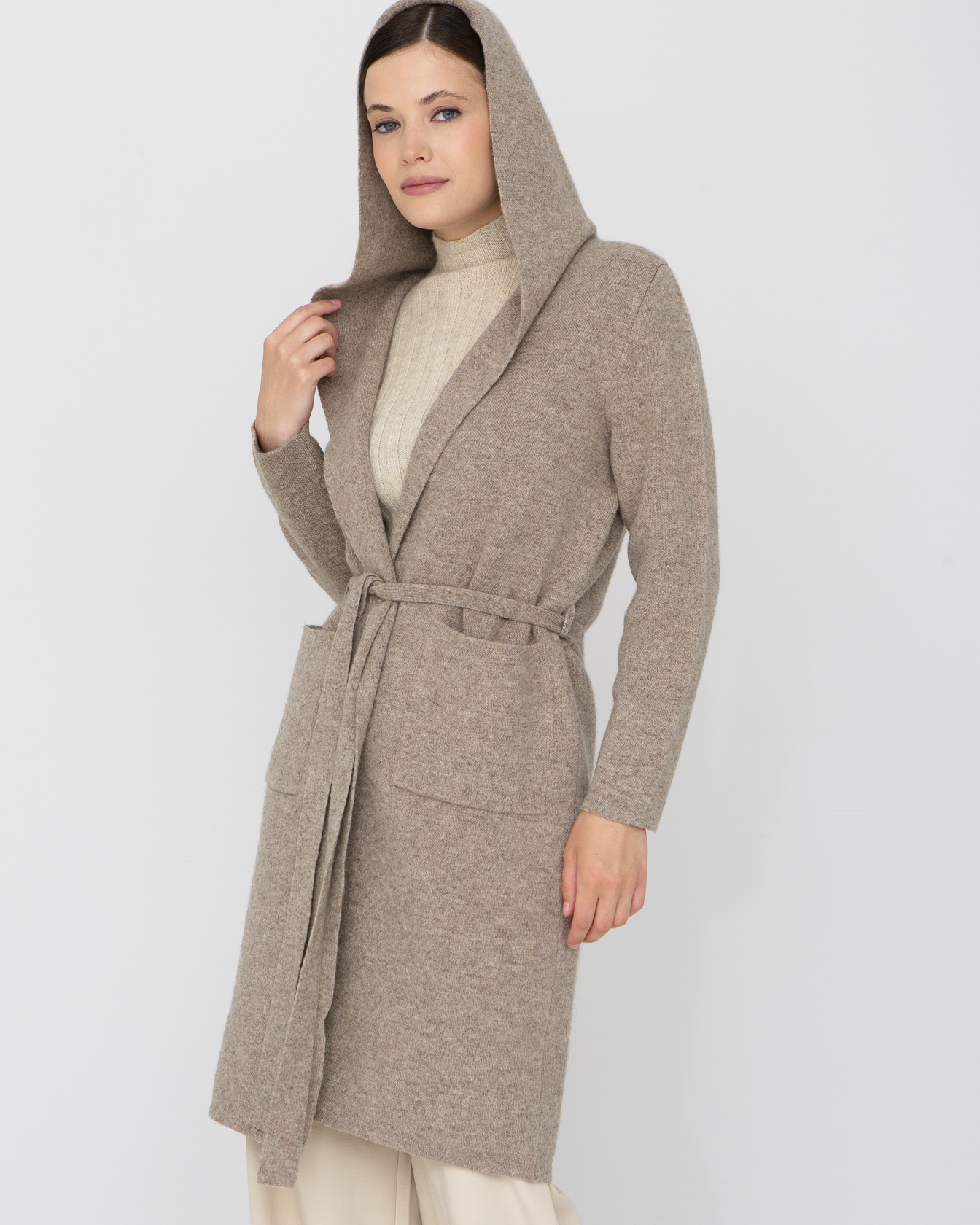 открытое пальто до колен с капюшоном и внешники карманами на поясе