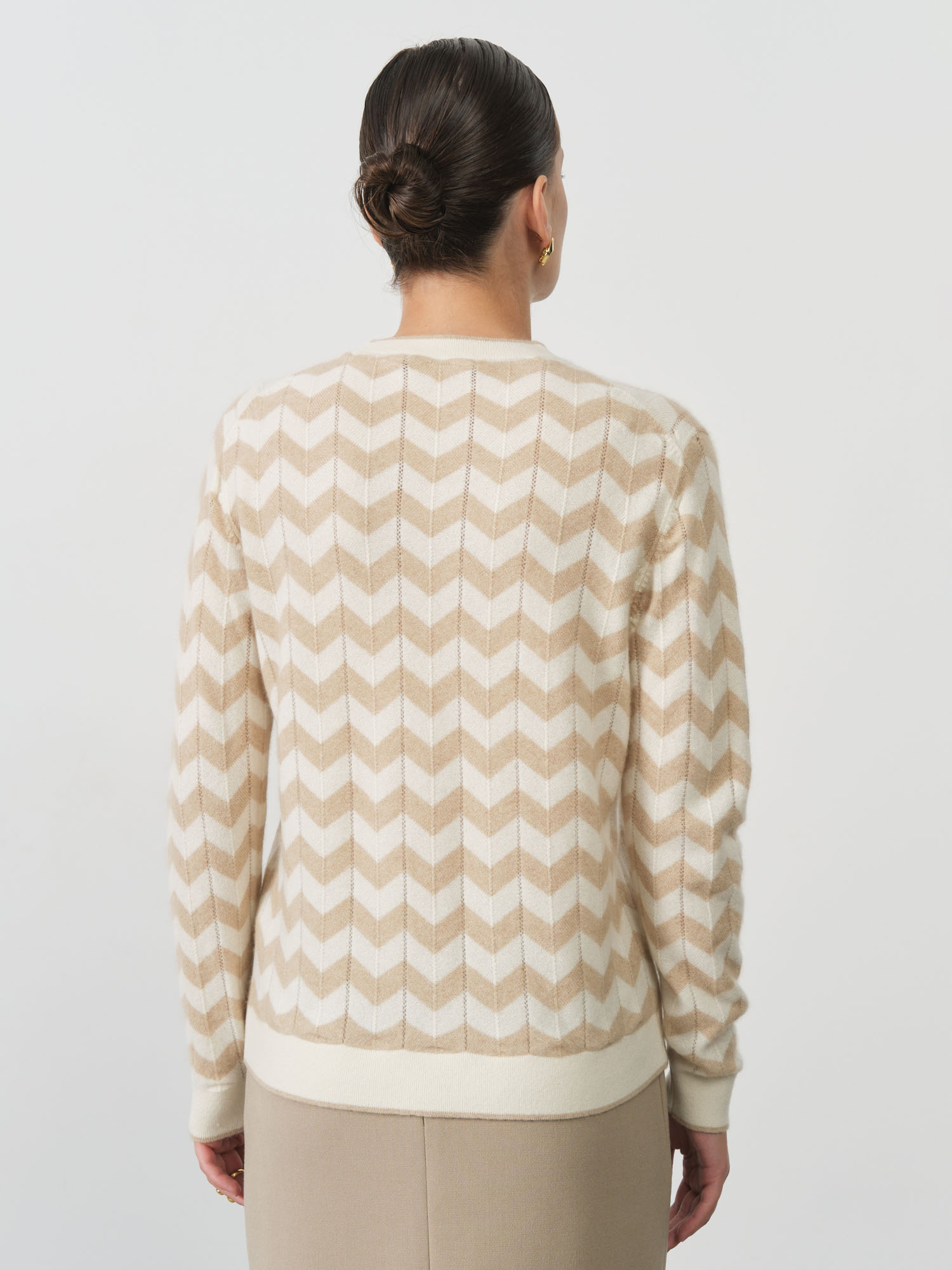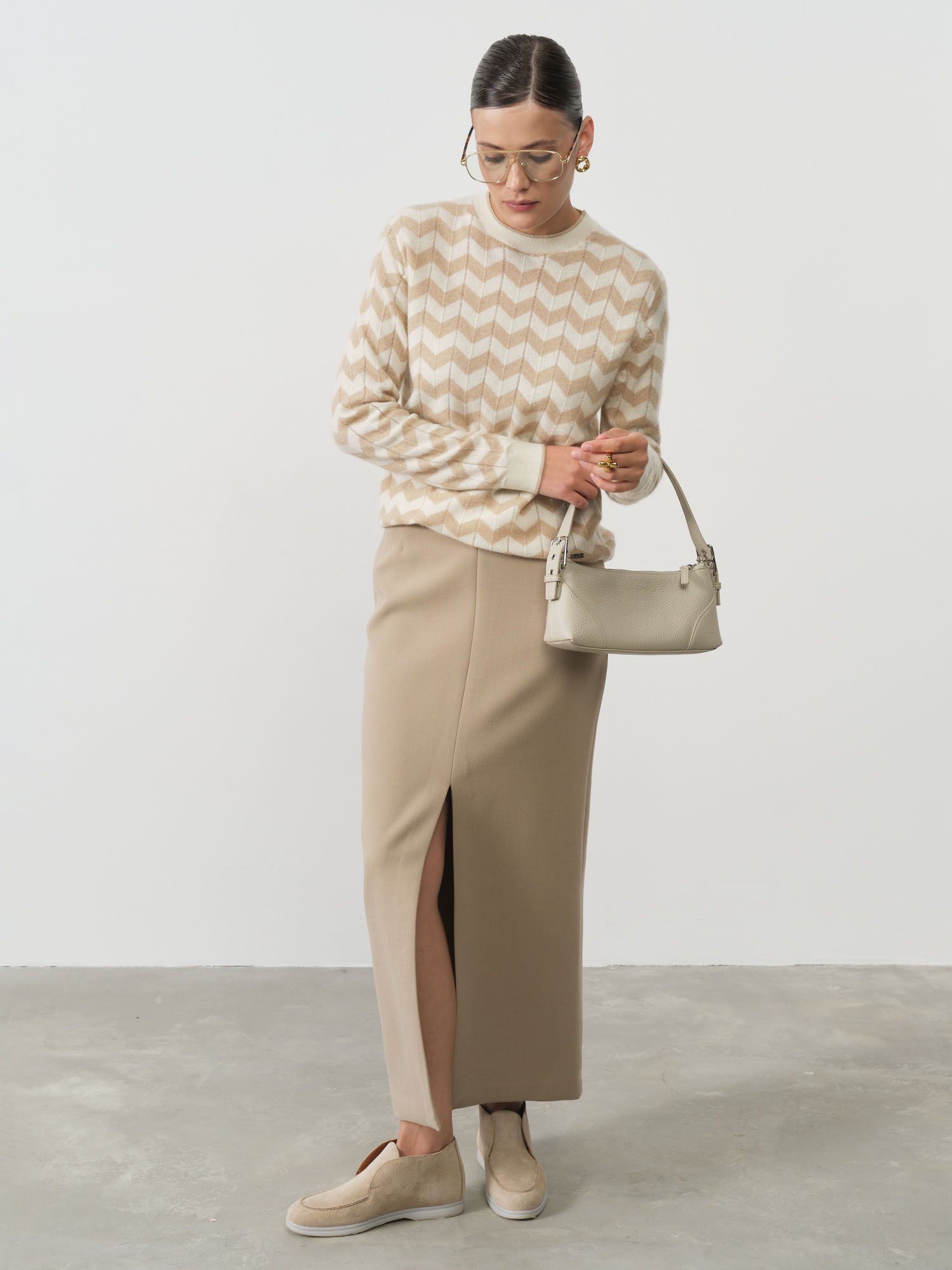 Благородный нейтральный оттенок делает эту модель универсальной основой гардероба. Джемпер одинаково органично смотрится с деловыми костюмами, создавая элегантный офисный образ, и с джинсами для повседневных прогулок. Полуприлегающий крой мягко обрисовывает силуэт, сохраняя при этом комфортную свободу движений, а классический вырез горловины добавляет образу завершенность.