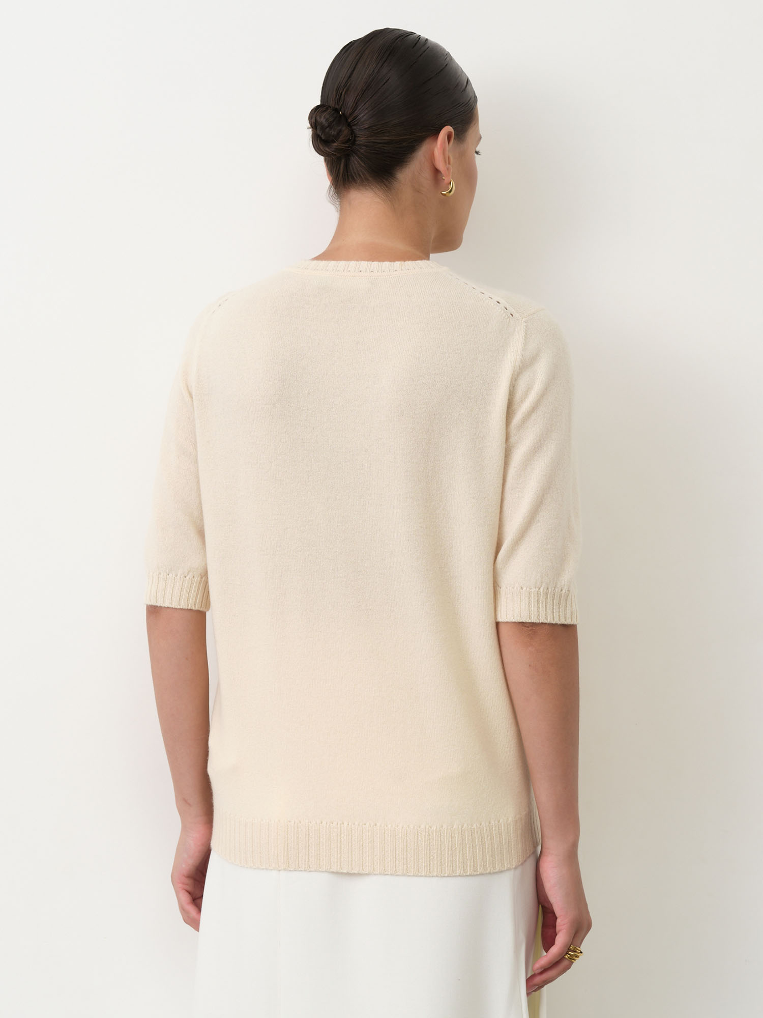 Модель выполнена с круглой горловиной и укороченными рукавами до локтя. Передняя часть украшена аккуратными декоративными карманами с небольшими бантиками, которые придают изделию женственный и изящный акцент. Гладкая вязка подчеркивает благородную текстуру материала.