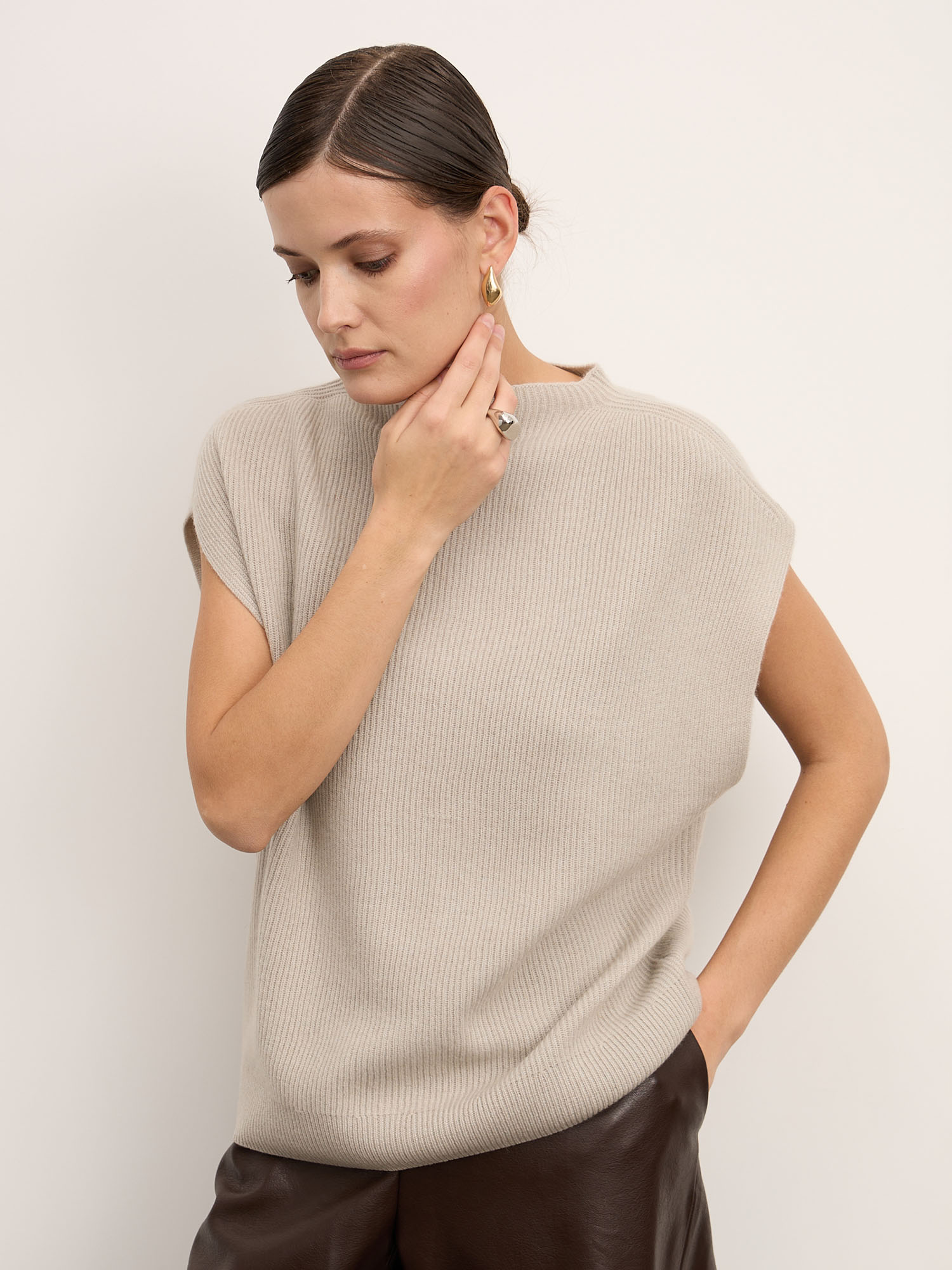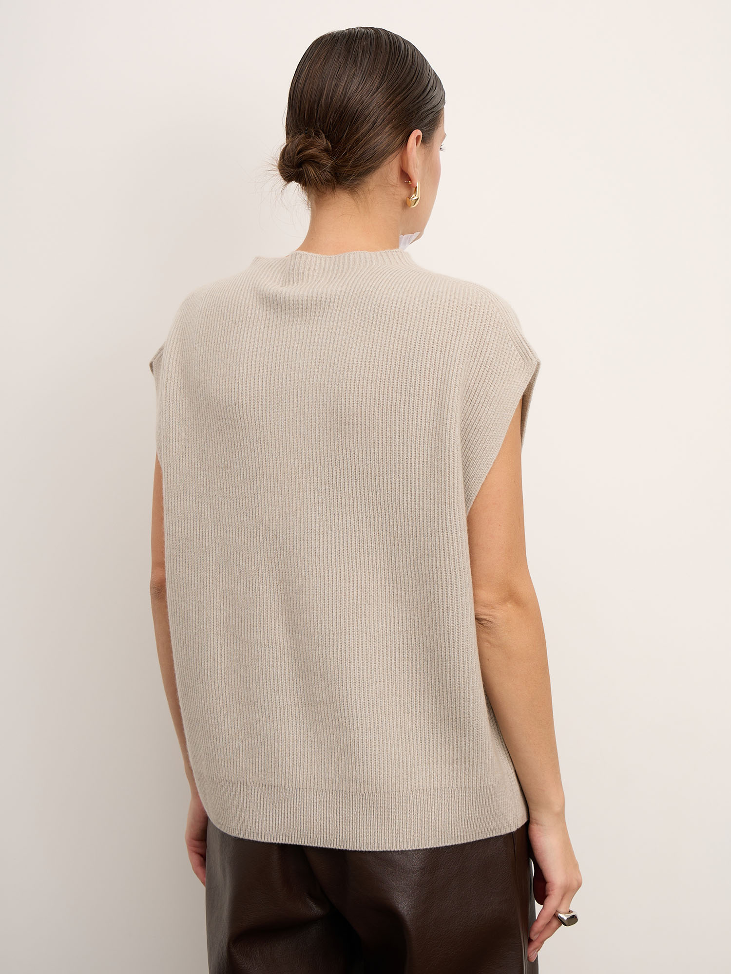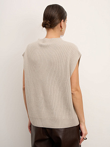 Модель выполнена без рукавов с аккуратным воротником-стойкой и гладкой вязкой. Минималистичный крой подчёркивает благородную текстуру материала и создаёт современный силуэт. Низ изделия оформлен эластичной вязкой, что помогает сохранять форму.