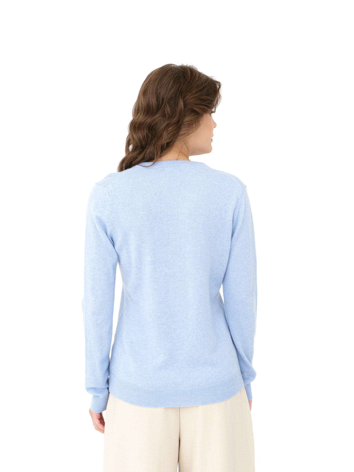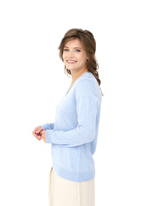 Голубой джемпер из кашемира с V-образным вырезом – это идеальное сочетание элегантности и комфорта. Выполненный из 100% кашемира, он обеспечивает мягкость и тепло, даря ощущение уюта даже в прохладные дни. V-образный вырез добавляет изделию женственности и изящества, делая его универсальным элементом вашего гардероба.