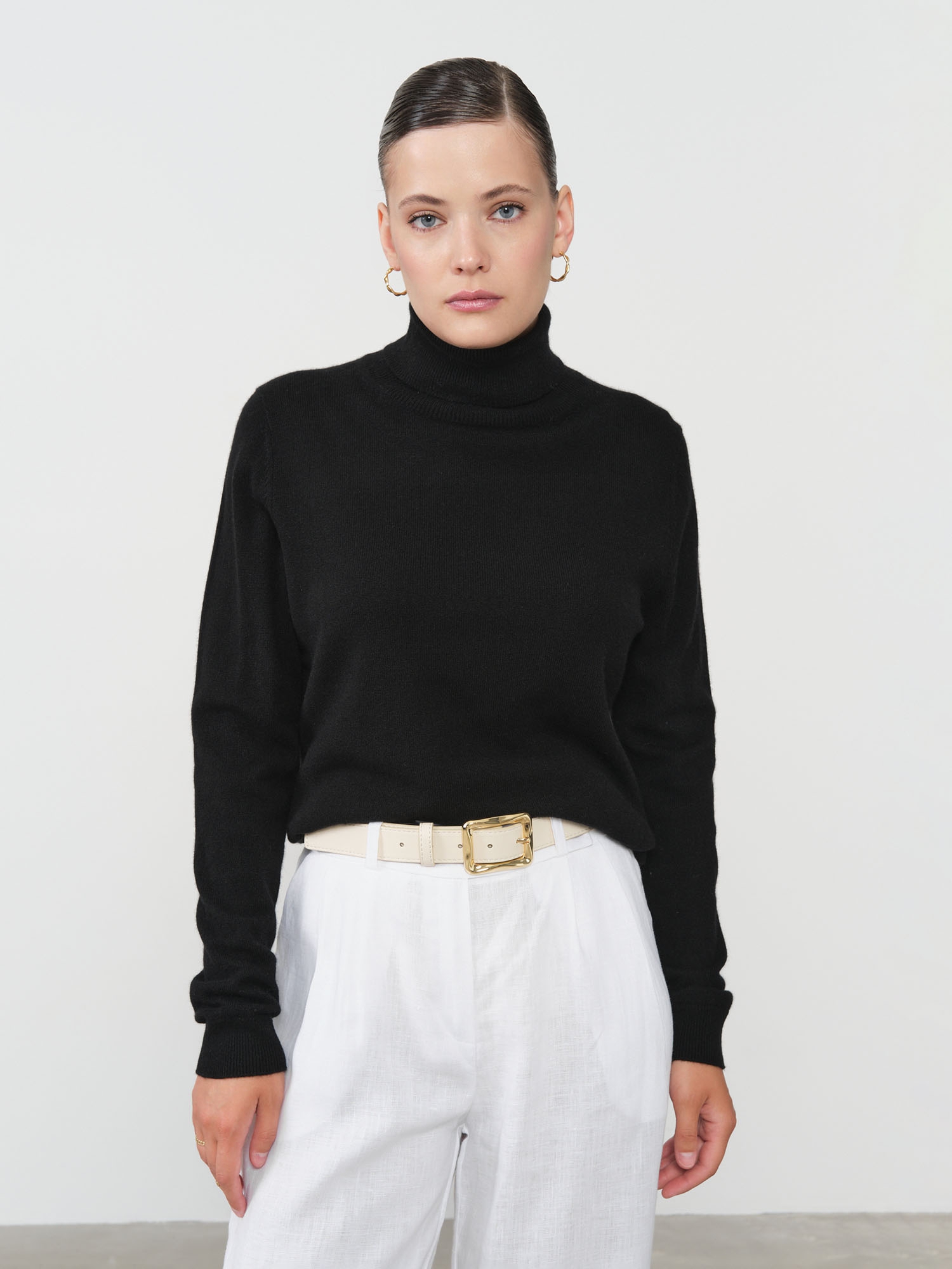 Черный цвет водолазки — это символ универсальности и стиля, который легко сочетается с различными элементами гардероба. Будь то деловой костюм, джинсы или юбка, эта водолазка станет основой вашего образа, добавляя ему строгость и элегантность.